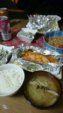 鮭のホイル焼き ほうれん草の白和え 切り干し大根の煮物 味噌汁 ご飯 昨日の夕飯は味噌だらけ(^_^;) 白和えはもう少し甘い方がいいみたいだけど、上手にできた🎵
