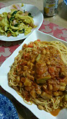 残ったミネストローネをトマトソースにし、パスタを作りました。 もう1品はキャベツとウインナーのカレー炒め。 野菜たっぷりの献立でした。
