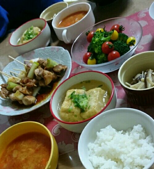 焼き鳥 きのこのマリネ 揚げ出し豆腐 ミネストローネ ブロッコリーサラダ お弁当のために作った焼き鳥。 初めての揚げ出し豆腐。 作り方はわかったからあとは味だ(笑)