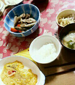 3月25日 塩そぼろとじゃがいものオムレツ 大根サラダ コーンクリームスープ 何年ぶりかにオムレツを作りました。 塩そぼろ、炒めた玉ねぎ、じゃがいもを混ぜて卵で包む。卵で失敗(笑) スープは適当に作ったわりには美味しくできました。 3月26日 手羽煮 新玉ねぎのサラダ かぼちゃのサラダ 味噌汁 娘の修了式でした。 一番上手に「ありがとうございました」と言えてました。親バカか。