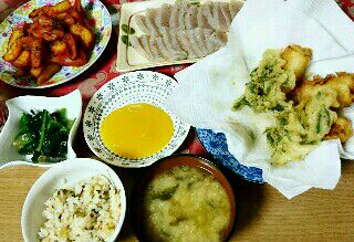 3月15日 わらびの炊き込みご飯 アイスプラウトの味噌汁、天ぷら 刺身こんにゃく じゃがいもとウインナーのケチャップ炒め ほうれん草のおひたし 春ですねー。 山菜の季節ですねぇ。 数年ぶりにわらびの炊き込みご飯を食べました。美味しかった。 長男も2ヶ月になり予防接種に行ってきました。 泣き叫ぶ子がいる中で、我が子は一瞬泣いただけでした。娘よりは泣いてたけどね。娘は本当に一瞬泣いただけだったな~。懐かしい。