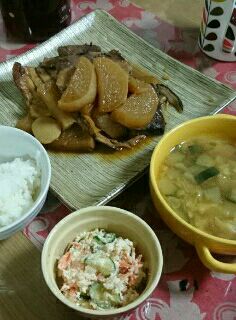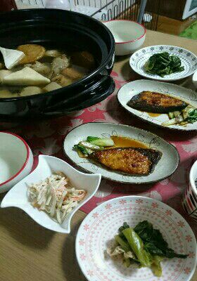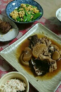 ぶり大根たくさんできたから2日続けてメインがぶり大根になった(^_^;) おからサラダも2日連続(^_^;) ぶり大根 おからサラダ スナップえんどうと卵のバター炒め ハンバーグ(冷凍保存) ご飯 メインが続くってちょっと寂しい夕飯になっちゃうな。