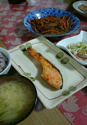 ちょっと寂しい夕飯ですが 鮭の塩焼き 切り干し大根のサラダ ヤーコンのきんぴら 味噌汁 雑穀米 切り干し大根は作った直後は辛かったけど、食べる頃には辛味がぬけて食べやすくなってた。