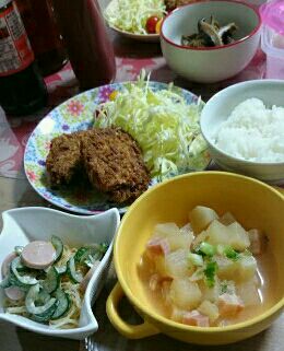 コロッケ 大根とベーコンのスープ 春雨サラダ 椎茸の含め煮 メインは決まるけど、副菜がいつも決まらない。 コロッケはコープで頼んだもの。甘めのしっとりで子供も食べてた。
