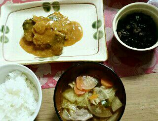 3月18日 筑前煮 ロールキャベツ(冷凍してたもの) きゅうりとわかめの酢の物 我が家の酢の物はすし酢で作ります。 このすし酢美味しいんです。 【広島県】【大竹市元町】【三国酢造】三国寿司酢720ml(10001181) わかめの酢の物にはちょっと酢を足します。 ロールキャベツはトマトを混ぜてみました。 子供があんまり食べてくれない夕飯でした(^_^;)