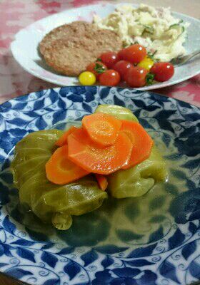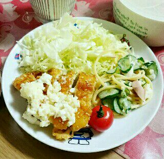 ロールキャベツ(コンソメ) ポテトサラダ ギョロッケ トマト ご飯 初めての椎茸入りのロールキャベツ。味は薄かったけど、上手にできた。ただ献立に悩む。ポテトサラダにしたけど、みんなは何にしてるんだろう。