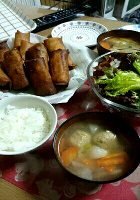 春巻き 肉団子のコンソメスープ サラダ グレープフルーツ 子供用にカレー 春巻きの具 1 豚肉、椎茸、ネギ、キャベツ 2 冷凍しておいたかぼちゃの煮物、チーズ 前回、春巻きをしたとき子供が全然食べなかったからカレーを用意したけど、かぼちゃの方は美味しいと言って食べてくれた。 かぼちゃ強し‼