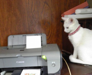 パソコンで印刷してたら、ミイがプリンターにびっくりして、さかんに猫パンチを繰り返していました。 写真はプリンターを睨んでいるミイです。 <新たな敵発見!>じゃあね