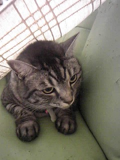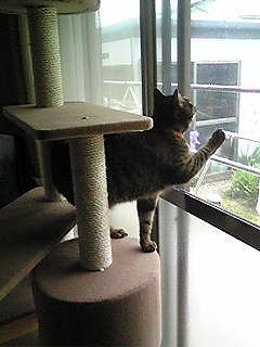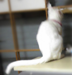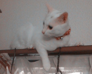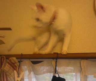超悪がきミイは、今日避妊手術です。 昨晩9時から何も食べられないので、イライラしているよ。冷蔵庫の上から、台所のカーテンレールの上を歩き、いたずら全開です <なんとなくそわそわ> りんの朝ごはんをサイドボードの上で食べさせていたら、いつもは上がれないサイドボードの上に飛び上がったよ 9時までに連れて行くので、後少しですお腹すいてんだろうね可哀想に 明日朝早く、迎えに行きます じゃあね