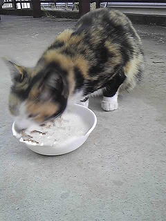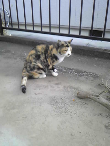 今日は、三毛猫ちゃんが全然来なかったのよ。 りんも私もずっと外を見ていたけど来なかったのよ。 <おなじみ・りんが好きな三毛猫ちゃん。毎日会うのを楽しみにしています> でも、違うが来ました。白にグレーがパラパラあって、初めて見るです。大きくて態度もでかいよ。 これからそのが、我が物顔で来ると三毛猫ちゃんが来れなくなるとかわいそうだから、あなたは駄目と言って帰らせたわ 三毛猫ちゃんが、何で来ないのか心配だわ 今までりんが、ゴロゴロ言って撫でて撫でてと纏わり付いていたけど、私が顔を近づけたらぷいっと行ってしまい、諦めて箱のベッドで寝てしまいましたじゃあね