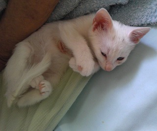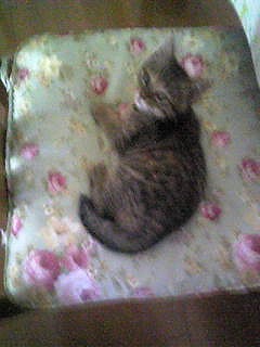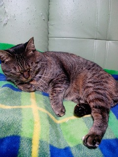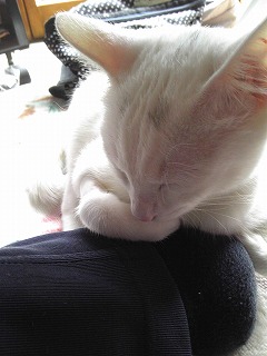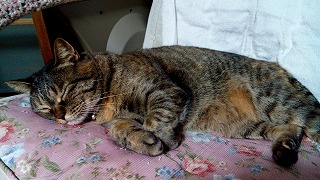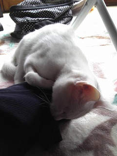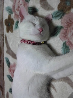 ミイは昨日退院しましたよ。猫エイズの心配もないそうです。獣医さん所では餌を食べなかったそうです。帰り際に注射をされましたよ。飲み薬も抗生物質を3日分もらって来ました。家に着いたら、1階も2階も全部あちこち匂いを嗅いで、それから安心したのかご飯を食べました。何だか少しおとなしくなったような………。私が昼ご飯を食べていたら、足に巻き付いて寝てしまいました。<やっと、安心しました>同じ姿勢でいると年寄りは疲れるんだけど……って言っても、気持ちよさそうに寝ています。夜中は寝られなかったんだよね。りんの穏やかな静かな時間は終わりましたじゃあね