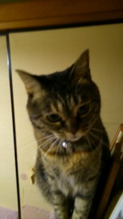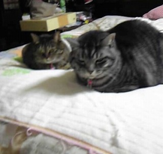 一昨日はりんもミイも仲良く同じ部屋で寝ていたのに、昨日はまた大喧嘩。で、私がミイを叱って追い出して、襖を閉めても、ミイは平気で鳴きもしないよ。<叱られても平気だもん>ゴソゴソしている音がしていたけどそのうち静かになって、2時頃トイレに起きたけど、2階にいなかったみたいよ。リンを閉め出すと、悲しそうに泣いて、襖をガリガリさせて可哀想になるけど、ミイはいいよ~と平気なのがちょっとしゃくにさわるよ朝5時半頃開けても、どこにいるか分からなくて、りんが下に下りて行くと、しばらくしてミイが部屋に入ってきて、枕元に近い所で私を睨んで、またしばらくすると枕の所に来て、体を擦り付けて来ます。何しろ強い猫だよじゃあね