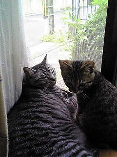 先日話したちびが(「りんにそっくり!」参照)、この間、道を歩いていました。<この子猫時代のりんちゃんに似ているんです>近づいたら、さっと逃げたので、どこかで食べる物があるんだね。痩せていたけど、走って逃げられるくらいだから、生命力があるんだなと、ちょっと安心しましたうちの2匹は相変わらずです。じゃあね