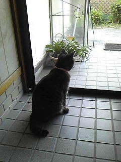 りんが好きな三毛猫ちゃんは、昨日も今日も来ていません。<おなじみ、変な模様の三毛猫ちゃん>昨日、黒猫が来て、なかなかよそに行かないで、編み戸の傍にうずくまって待っているの。私の顔を見ると、ニャアニャア言っているのよ。えさをあげたかったけど、あの調子で毎日台所の外で催促に来ると、近所に嫌らしいじゃない我慢していたら諦めて帰りました。何となくジャイアンみたいで笑えました。 りんが興奮して、居間まで走っちゃまた見に来るを繰り返していました 今年は野良猫ちゃんが沢山いて、りんは好きだから毎日外に興奮していますでも尻尾振って騒いでいるから遊びたいのかも 面白いよじゃあね