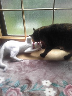 昨晩は、りんは私の布団の側の座椅子にずっと寝ていたけど、ミイはそこら中歩き回り、いなかったのよ。 でも3時頃、私のお尻の側(布団の中)にいましたわ。 寝る前は、儀式のように30分も四つ相撲やら追いかけっこをしたりするのよ。 <朝から晩まで毎日おんなじことやってます> 夜の四つ相撲の写真はあまりにも動き回っているので、うまく写真に取れないのよ。 みいは痩せているけど体が大きくなり、りんと高さは一緒ぐらいで、迫力ある喧嘩だよでもその後は何もなかったような顔しているのは何なのかねじゃあね