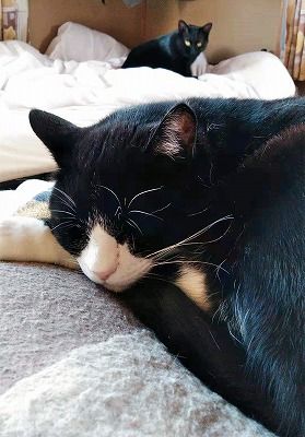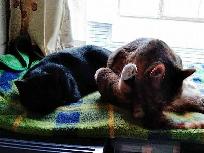 あなたを送って空港から家に帰ったら、クロが猫タワーで出迎えてくれましたそれからユウとクロがベタベタ甘えて来たけど、今は皆さんお休み中。<娘がいる時はあまり行かなかったいつものスペースで寛ぐアイとクロです>やっと、いつものペースが戻ったようですよユウは椅子の私の隣に座り、クロが側に来るとシャアシャア言ったり、唸ったりで威嚇してました。おやつを欲しがったので、かりかりおやつをやったのに、おやつ大好きミイは起きて来なかったわ。<変なやつの相手をしすぎて疲れたにゃん>ユウが二人前食べちゃったじゃあね😁😸😸😸😸😸😸