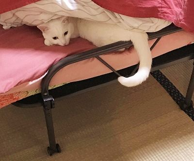 でっかい顔で失礼<ユウの甘え顔です>ユウが私の布団に潜って、また腕を枕にゴロゴロ言ってるよどうしてユウがここにいるかと言うと、りんがユウの寝床にいるからりんは私の側(ソファ)をユウが取ったから、ユウの寝場所を取ったのよユウは自分の寝床に行ったらりんがいて、怒らないですごすご私の布団に来たわ。 ユウだって、りんの好きな場所を取ったんだからしょうがないわねじゃあね😁😸😸😸😸😸😸