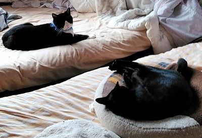 クロがユウの寝床で寝て、ユウはそれをじっと見ています <怒らないけど無言の圧力> さっきはクロは、私のところへも邪魔しにきたよ 私がクロを撫でていたら、机の上にいたユウと、窓ぎわにいたアイがジトッとした目で睨んでいました 今りんが私の隣で、喉をゴロゴロさせてすり寄ってきたよ じゃあね😁😸😸😸😸😸😸