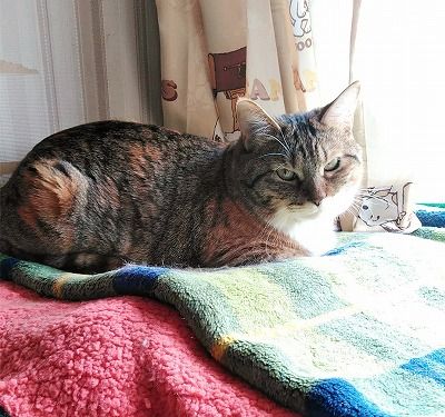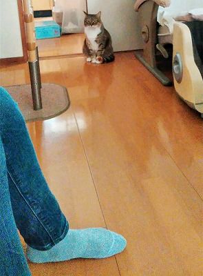 昨日に続いて、帰省中のかあちゃんの娘が書いてます。ミイは一番私にひっついてくれました。〈寝るときはベッドの足元で待機〉夜中は隣でグーグー。〈かわいすぎる〜〉明け方、目を開けたらミイが覗き込んでいて、私の枕の横でゴロゴロ言い始めますので、撫で撫でします。〈ちょっと違うところ触ると噛み付いてきます〉かあちゃんがテレビを見てると、隣にちょこんと座りました。〈あまり甘えないけど、何気に近くにいます〉今日で帰るのですが、朝起きて着替えてたら、ミイがずっと見てました。帰るって分かったのかな。〈私には結構撫でてと要求しますが、なぜかかあちゃんにはあまり撫でてと言いません〉ユウも結構ウロウロしてくれてました。〈知らない人がいても全然平気にゃん〉晩ご飯の時間が近づくと、特にウロウロ。〈2階に行こうとすると先に上がり始めます〉私の顔を見ながら、タタタッと前を走り、ご飯の場所へ行きます。〈自分のご飯茶碗の前で無言でジーッ〉まだ早すぎなので、ご飯入れないで下に行くと、また同じことを繰り返してました。ある日は、りんがユウの茶碗でうっかり食べたら、終わるまでじっと待ってました。〈この茶碗じゃないと食べたくないにゃん〉ユウも私と同じ部屋にずっと寝てましたが、昨日は寝言を言ってました。それにしてもこの数日間、ニャンズはとにかく食欲旺盛。母もびっくりするほどです。知らない顔がいるというストレスなのかしらん。ユウはご飯をもらうのを催促するけど、入れてあげて一番に食べ始めるのは5ニャンズの中で一番小さい(それでも大きいけど)ミイでした。ニャンズとワヤワヤ過ごした、とっても幸せな数日間でした。