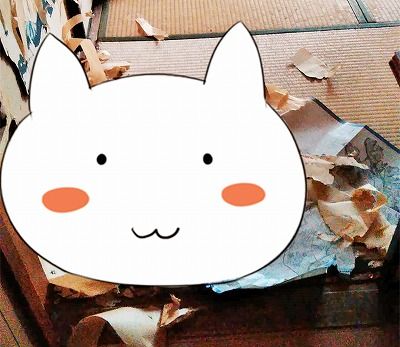 昨晩寝る前に、アイが見えないなと思いながら布団に入ったのよ。 でも何となく気になって、12時ごろ下に行って台所とリビングを見たけどいない。 上に上がってまた布団に入り、寝られないまま、そうだ、下の和室は見てないなと思いました でも私が和室に入った時、着いて来たのはミイだけだったのよ。 だけど気になって見に行ったら、和室がすごいことになってました から紙はビリビリ、カーペットは丸まっていました。 <あまりにもひどいので自主規制> さんざん暴れて、くたびれて、丸まったカーペットに寝てました。 〈かあちゃんがリビングなどを探してる時は、ここでぐっすり寝てるところでした〉 開けてやったら、走って2階に行ったけど、私が布団に入ってから、たぶんアイとクロが2匹でドタドタ走り回り、玄関の靴がクチャクチャになってました。 アイは「開けて、開けて」とから紙をガリガリやってたんだろうね 可哀想に じゃあね😁😸😸😸😸😸😸