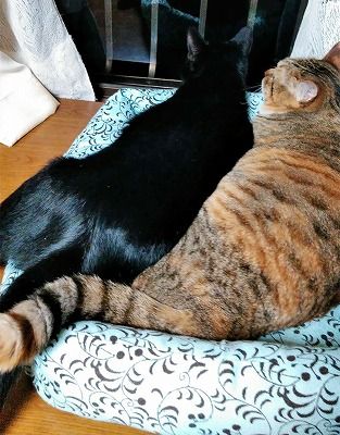 写真は、机の猫ベッドに最初アイがいて、クロは私に甘えていたけど知らん顔してたらアイのところに無理矢理入り込んだのよ<クロはアイとかあちゃんに甘えたいのです><横は空いてるけど猫ベッドがいいのです>本当にアイはやさしいよ今は追い出されたかっこうで、私の周りを歩き回っているわ。じゃあね😁😸😸😸😸😸😸
