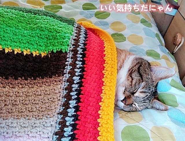 私の隣にいたアイに毛糸のカバーを掛けたら、寒かったのか、中に潜って行って、じっとしてるわよじゃあね😁😸😸😸😸😸😸