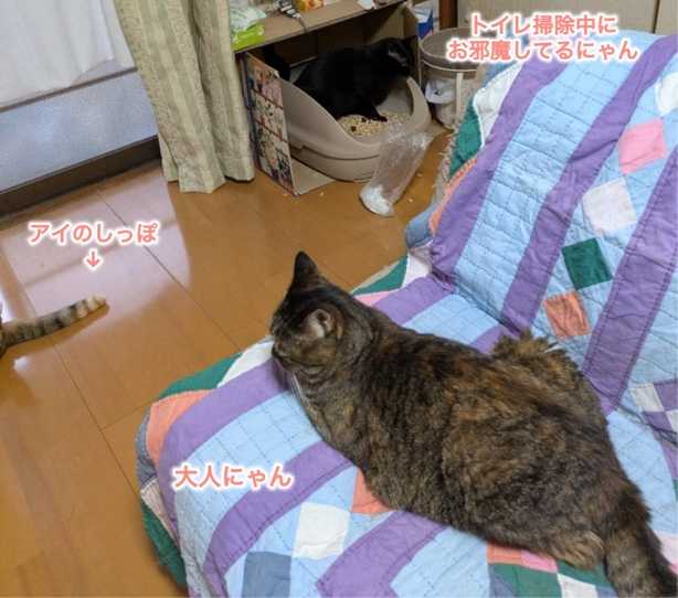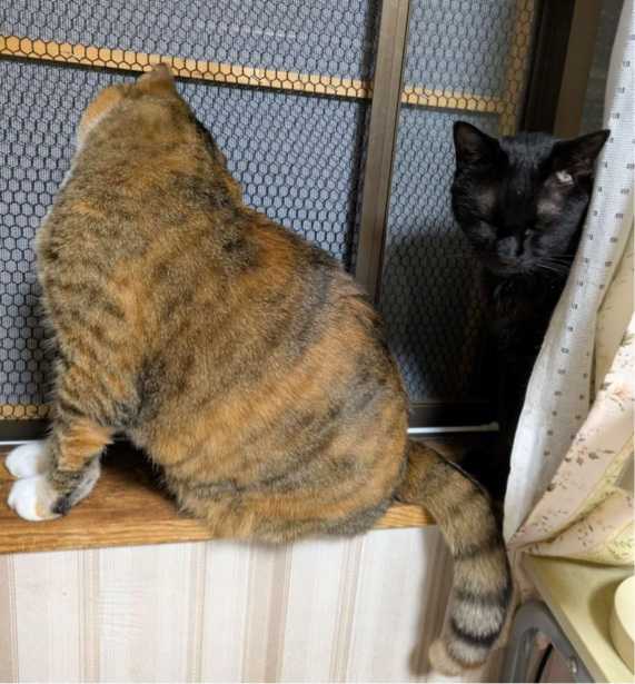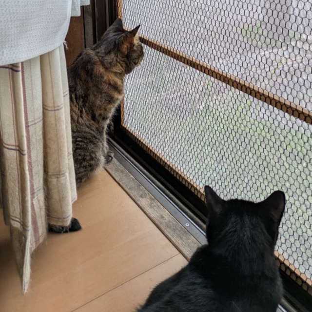 2階の私の寝ている窓だけ網戸にしたら、アイが全面的に場所をとり、クロベエが行きたくても行かれない。写真を撮ろうと電気を付けたらアイが移動したので、クロベエにもチャンス到来。外見ないで、場所取りに必死でした😆その後すぐにいないわよ。夜の暗い時に、庭の方見ても何もない。アイはずっといるけど、クロベエはすぐ飽きる。アイの場所を取ってやったっていうのがやりたかったんだものね😛😛😛🫤アイも強いよ。最近はミイについてくるだけじゃなく、追いかけてるからね。ミイかシャアシャア言いながら走ってきて、私の所に逃げて来る。普段は並んでいても何もないのに、下にいると走って上がってくる。ミイも強いはずなのに、時々あるのよ。アイは子猫の気持ちでミイに寄るけど、デカくて怖いんだろうね😱最近アイも、本気で追いかけてるしね。追いついてミイにパンチするもの。柔らかいパンチだけどね🤭顔は怒ってないからね。アイはふざけて追っかけているのかもね。遊ぼう!って思って、ミイが必死に逃げるから面白くて追いかけるんじゃない?アイは楽しそうだもの。ミイリンが怖がりすぎ😉今日のおやつはM子(次女)が送ってくれたチュールにしたら、ミイとアイは文句なしに食べて、リンは少し食べただけで離れて行って、しばらくして残した物を寝そべっていたリンに持って行ったら食べるのよ。何考えてるんだ? だよ。クロベエは全然食べませんでした。缶詰なら、人の物まで食べるくせに😤部分入れ歯が壊れて新しいのを作ってるけど、完成はもう少し後になりそうです。しばらく、誰とも会わないからよいわ。でも、カズミや別の友達とランチしたけど、2人とも気がつかなかったよ。本当にマスクが当たり前だから、良いわよねえ🤭じゃあね😁😸😸😸😸😸😸