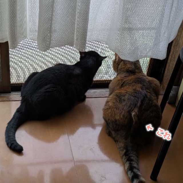 いくら普段クロベエがリンを脅していても、外を見る時、一番良い場所にいるのはリンだね🤗アイは後から来たから、さらに後ろで行こうかどうしようか迷っている。ミイは網戸になったのを知らないから、いないのかも。今朝、下の部屋に白いのが吐いてあったけど、誰のだか分からない。たぶん、リンかなと思います。なんとなく、日中リンが元気ない気がしたけど、昼ごろチュールをやったらペロリと食べて、夕方の缶詰もいつも通り食べていたから、ちょっと安心よ。昼間リンは猫タワーにずっといて、動かなかったからね。今は元気よ。一番良い場所で、外を見てるわ🤗昨晩寝ていなかったから、とにかく眠たかったのかもね。胃の薬がまだあるんだけど、茶わんにチュールと薬を入れると残すのよ。チュールだけなら食べるけど、薬が分かるみたいよ。アイの方が鈍感よ😉最もアイの痒い痒いの薬はほんの少しだから、騙されるのかもよ。リンの胃の薬は結構あるからね🤭缶詰はおやつとしては高いから、毎日だと大変😅カリカリごはんも、いつも通り食べちゃうからね。クロベエはチュールを食べなくなった。食べない時は、「もうオヤツはないからね。ご飯を食べなさい」と言うと、不貞腐れて自分の寝床に行って寝てるわよ。缶詰の時は、食べ終わるとあちこち歩き回っているのにね😤カリカリ系なら食べるかもしれないから、明日はリンミイはチュール、後の2人はカリカリオヤツにしてみるけどね。夕方、期待満々で来て、自分の好きな物じゃないとがっかりするだろうしね。アイは缶詰は食べないけど、カリカリオヤツなら食べるわよ。クロベエはチュールも食べる時もあるのよ。しかも同じチュールなのに。その時の気分なんだよ。その点ミイは選ばないで、出されたものは必ず食べる本当に良い子よ。やっと今日、アイは寝そべっている所のすぐ側を通った時、動かないでじっとしていたわ。でも、緊張しているのが分かるわよ🤭踏まれたのが怖かったのね。可哀想に🤗それでも寝そべるのはやめない🤭🤭笑っちゃうね🤭じゃあね😁😸😸😸😸😸😸