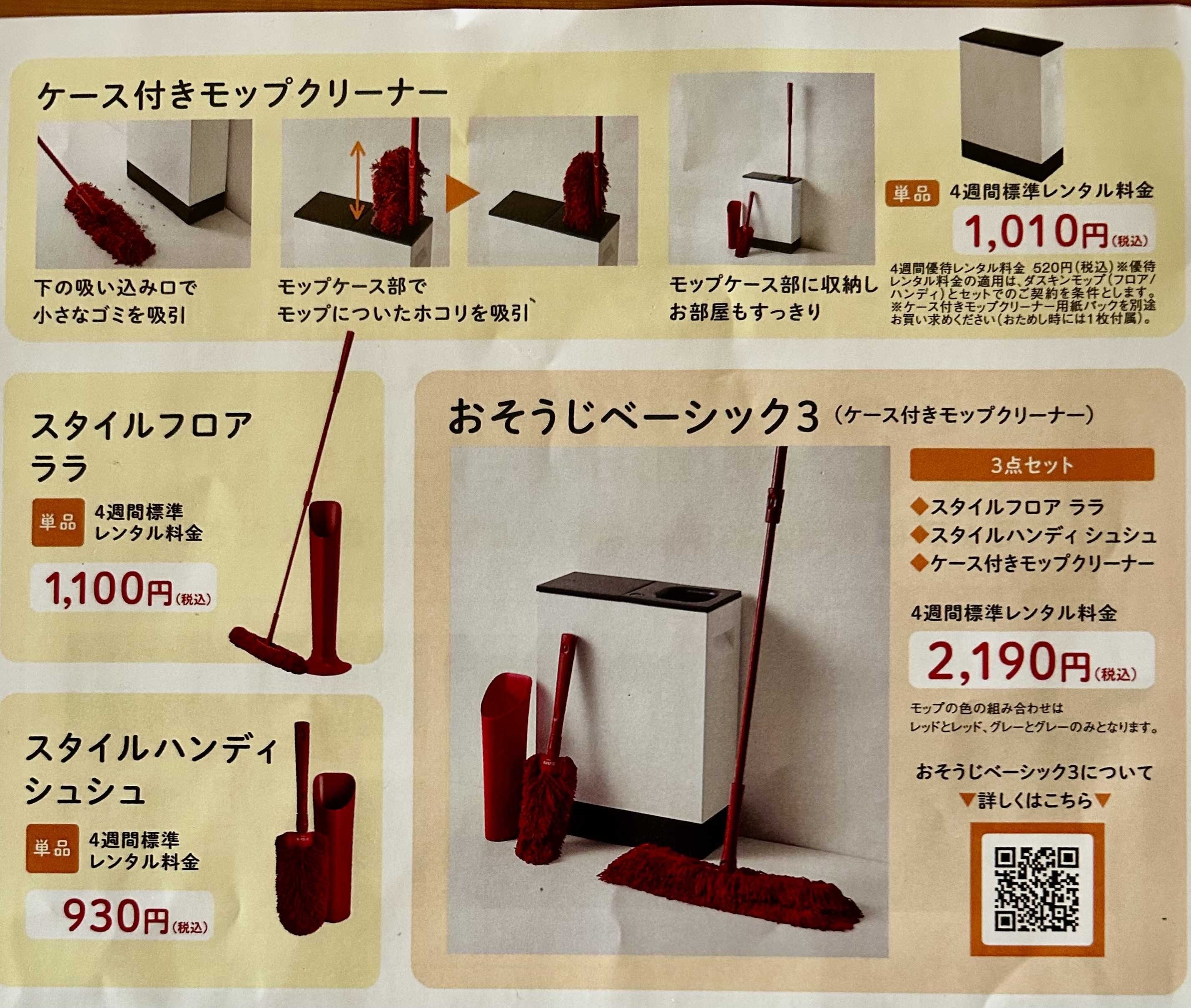 ってことで、ちゃんとモップのホコリを吸引してくれる「モップクリーナー」もレンタルしてもらえるのね。そして、4週間ごとにモップを取り換えてくれるというシステムね。