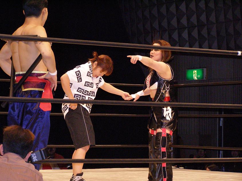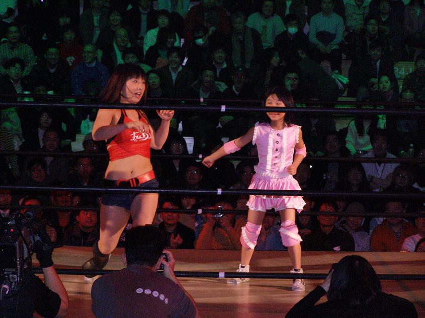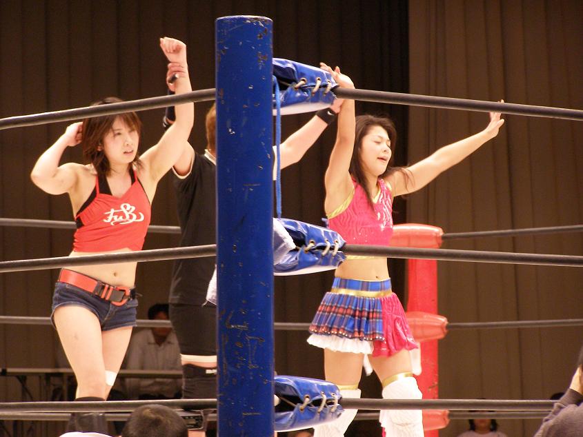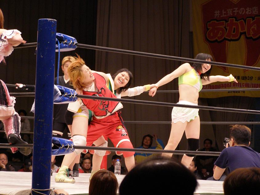 ◆第2試合 15分1本勝負風香りほvsチェリー真琴風香&りほ組は風香のリングインの際のダンスを一緒に披露。記者会見にてりほ『チェリーさんはお姉さんというよりお母さん』との発言にてブチ切れたチェリーがりほを執拗につけねらいます。試合前の握手から力を込めて、りほちゃんがひざまづくほど。しかし、試合になればりほ様は巧みに風香を楯にし、逆にチェリー&真琴に攻撃を加えていきます。りほ様、ホント試合巧者よ。そして、真琴をキャメルクラッチに捉え、いつもの”にこにこ印”にいこうとするとチェリー『させるかー』と、カット。当然場内は大ブーイング。りほ様はその悔しさからか、チェリーをノーザンライトスープレックスで投げきりました。フィニッシュは風香が真琴をフィッシャーマンズスープレックスで仕留めて、風香&りほ様組の勝利に終わりました。りほ様『チェリーさん、この間は”お姉さんじゃなくてお母さん”なんて 大人気ないことを言っちゃって、ごめんなさい』りほ様からの謝罪の言葉を受けチェリー『りほちゃん、大人気なかったのは私かもしれないよ。 こっちこそごめんね。 さっき邪魔して出来なかった”にこにこ印”をみんなでやろうよ。』ということで、ハッピーエンドでした。りほ様、NEOのホールのレギュラーを狙っているそうですが、是非ともお願いしたいところです。次のホールは5月5日、子供の日ですし、次回後楽園への参戦はまず間違いないところでしょう。
