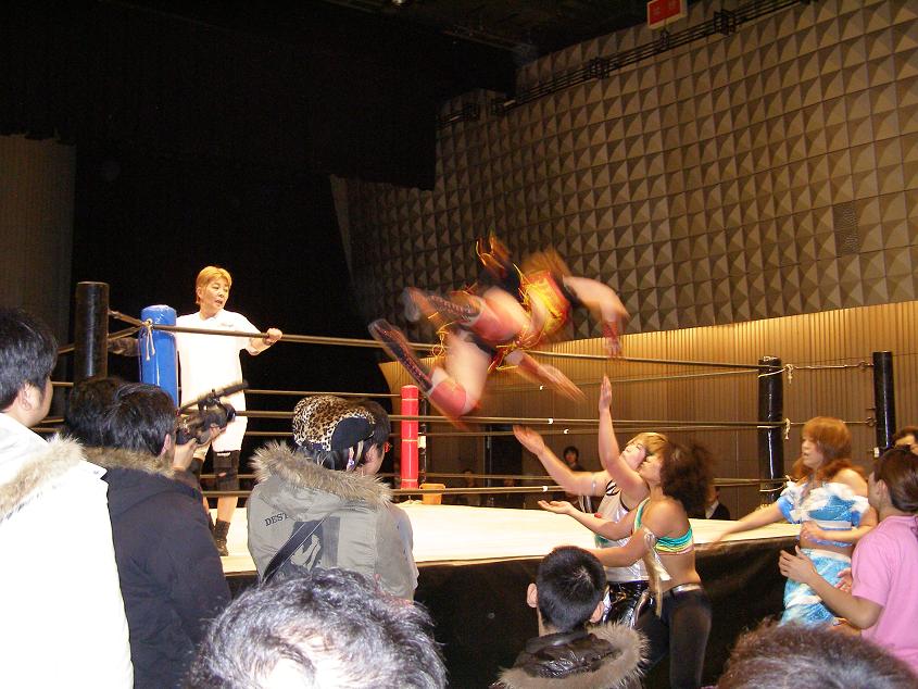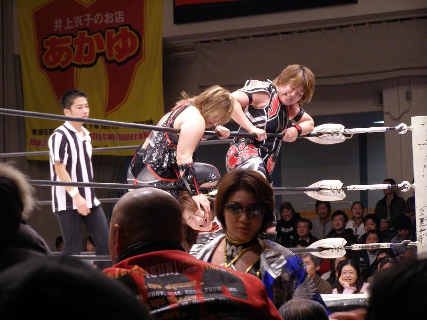 ◆第5試合『井上京子復帰戦』30分1本勝負井上 京子野崎 渚vsさくら えみ勇気 彩1月6日の後楽園でプレ復帰を果たしている京子さんですが、今回は事前告知もあり、入場時から場内は”お帰りなさい”ムード満点。ここまで入場者について一切触れてはいませんでしたが、今回の後楽園はいつものNEOのように北側をほとんど潰して入場ゲートを置いたりすることはなく、新日本が使ったりするような通常バージョン。新日本などがホールの札止めを1800人と発表していますが(過去の猪木時代には超満員札止め3500人なんて発表もありましたが)、ぴあなどでホールの案内を見ると、どうやら完全な実数は1600ちょっとぐらい。新日の発表は立ち見も含めてなのだから、まあ、ほとんど実数というところでしょう。で、今回のNEOの発表は1374人(超満員)。京子復帰を歓迎する、しばらく女子プロから離れていたファン層が来てくれたと言う事でしょう。この日の夜にZERO1-MAXの興行があり、新日本との対抗戦を行うというのもポイントだったかもしれませんね。(私的にも行こうかなと思いはしたのですが、この後秋葉で買い物してたら行くのが面倒になって、そのまま帰ったんですが。 ま、それはいいや)さくらが名を連ねこそしていますが、当然この試合のポイントは勇気と野崎。先の北沢大会で見せてくれた気迫を、そのまま京子さんに(野崎の場合さくらと勇気に)ぶつけられるか?勇気はさくらのリードもあり、果敢に京子さんにぶつかっていきました。なにより、相手は井上京子です。遠慮など不要な相手。その分では、勇気にとってはそれほど高いハードルではなかったのかもしれません。野崎にしても、さくらと勇気なれば、勝手知ったる相手というか、変な遠慮は要らない相手ですので、普段着どころか図太さを発揮。なんと京子さんに「コーナーに登れ」と指示していました。この辺を見せられただけでもたいしたものではないかと思います。そして井上京子です。私的に、京子さんに関してはまったく心配していませんでした。なんといっても、あの井上京子です。1年のブランクがあるとはいえ、あの天才に対して心配なんてことは失礼です。確かに動きの冴えは無かったですし、レベルサを失敗(ロープを踏み外した)したりしたシーンもありましたが、この辺は数試合こなせば問題ないでしょう。この下の写真を観ていただければ、井上京子に何の心配も要らないことが分かっていただけると思います。ナイアガラ・ドライバーで勇気を沈めた京子さん。マイクの最中、三田さんが愛息・りき君を連れてきました。京子「三田さん! なんてことするんですか! リングの上にプライベートは持ち込まないつもりでいたのに。 その覚悟があっさり崩壊しちゃったじゃないですか!」 京子さん、りき君を抱えたその笑顔がとても幸せそうでした。井上京子は、ママになっても変わりません!むしろ、守るものが増えて、よりパワーアップしていくのではないかと思います。 とにかく、お帰りなさい、京子さん!!