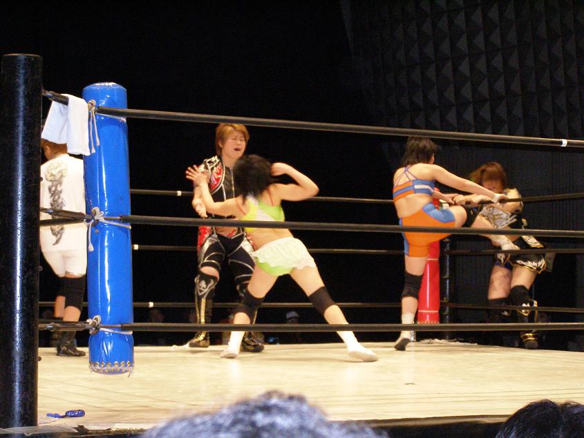 ◆第3試合 和製ルチャドーラ逆輸入 15分1本勝負宮崎 有妃(NEO)植松 寿絵(フリー) vs下田 美馬(フリー)渋谷シュウ(フリー)ネオ・レディース旗揚げメンバーの一人でもある下田美馬姐さんと、3ヶ月のルチャ修行から帰ってきたシブちゃんの組み合わせに対するは日本女子プロ界屈指の技巧派・宮崎&植松。メキシコ帰りのシブちゃんが場内にコールを要求しますが、植松がそれ以上の歓声を集め、植松「人気の差だな(^^)」とご満悦でした。美馬姐さんと宮崎の絡みは久々ですが、スイングしてます。また、美馬姐さんと植松の組み合わせも目新しい感じ。宮崎がコーナーに控える美馬姐さんを挑発するのに、リング中央で攻防中のシブちゃんを踏みつけてリングを往復すると、それに応えた美馬姐さんが味方のシブちゃんを踏みつけ、これまた往復(笑)一方のシブちゃんは宮崎がコーナーに美馬姐さんを追い込んだところにカットに入るべく宮崎を蹴り付けると、勢いあまって宮崎がコーナーの美馬姐さんに倒れ掛かるムーブ。こういうの、メヒコ仕様なんですかね(笑)フィニッシュは美馬姐さんが植松選手の足を折りたたんで決める複合関節技。京子さんが昔使ってたスパイダーネストみたいな感じの技でしたねえ。終了後、コーナーに駆け上がったメキシコ帰りコンビ。シブちゃんの写真、よく撮れるわ。