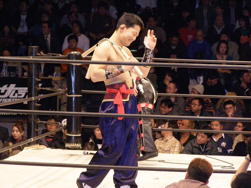 ◆第3試合 『錦馬超杯国際選手権アジアやり直し予選』15分1本勝負植松寿絵(日本代表)vs趙雲子龍(中国代表)前回北沢大会では三節根を使った演舞を披露した趙雲。本日はダブルヌンチャクでした。ですが、今日も撮影に失敗しましたよ・・・・・・orz植松『おい! 実行委員! 甲田! 今日はまともなレフェリーを連れてきているんだろうなあ?!』甲田『日本と中国の戦いにふさわしい人を連れてきています。 日本と中国・・・東洋ということで、この人です!!』流れてきたテーマ曲は、あの『ヤンキーステーション』JWPのリングでは何度か特別レフェリーを務めたことのある、ザ・グレート・カブキさんがレフェリーでした。カブキさん入場の際、趙雲がダブルヌンチャクを持ってきていることから、植松が趙雲に『おい、大丈夫か?』みたいなことを言ったようで、趙雲がかなり動揺し、ヌンチャクをコーナーポストに掛け、目立たないように、カブキさんの目に付かないよう趙雲自身が楯になっておりました(笑)さて、その特別レフェリーの下で始まった試合ですが、これも北沢大会と同様、序盤は技術を駆使した攻防に終始。カブキさんが思わず拍手を送るシーンもあり。しびれを切らした趙雲がラフファイトに移行。植松も応戦。互いに首絞めを行い、レフェリーチェックにあっている隙を突き、趙雲がヌンチャクを持ち出しますが、これを奪い取ったカブキさん、本家ダブルヌンチャクを披露。これは写真に撮れたー。良かったー。展開はその後もラフ中心。互いが技をすかすとカブキさんに当たる感じ(笑)怒ったカブキさんが趙雲にアッパーカットから毒霧噴射。植松がエビに固めて3カウント。正直、前回のヨネヤマカオ・リーのインパクトの方が強かったし、中国寄りのレフェリングってのもツボに入って面白かったです。