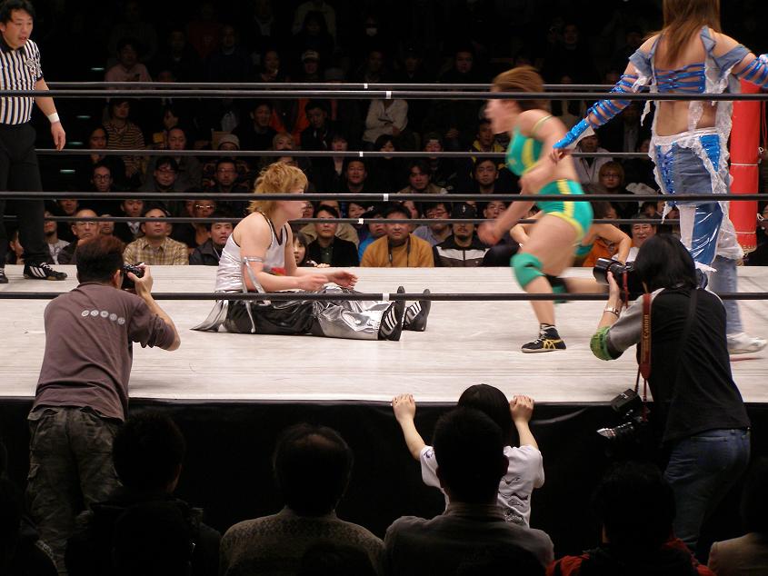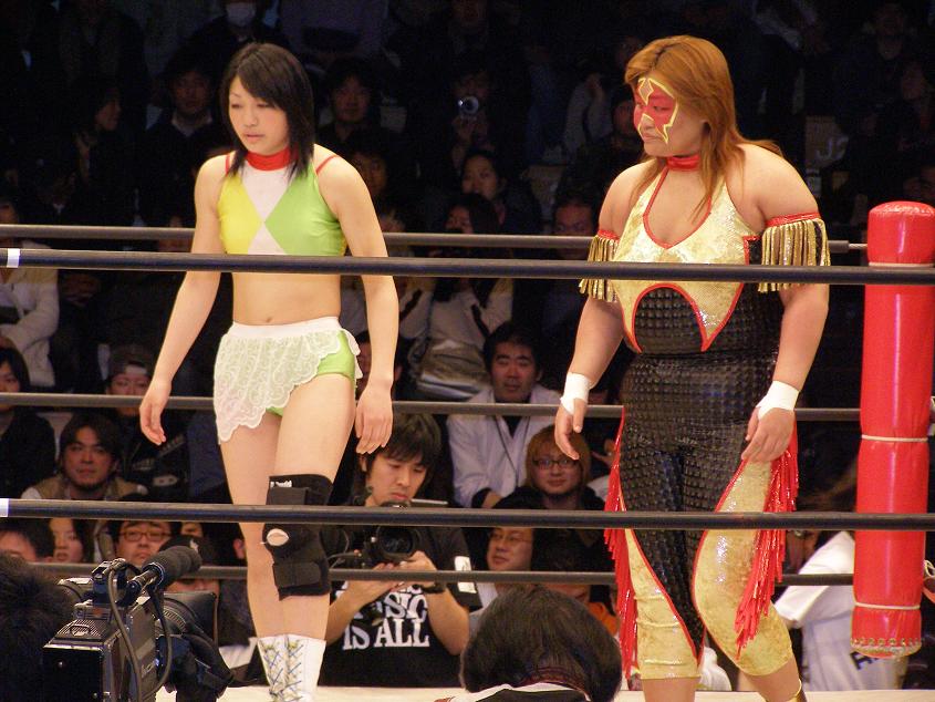 ◆第1試合 青春緑vsJWP 15分1本勝負希月あおい(アイスリボン)野崎 渚(NEO) vs中島安里紗(JWP)大木アスカ(JWP)体調不良もあり、13日のNEO大阪大会を最後に他団体への出場をしばらく控えることになったあおいちゃん。関東地区でのNEO出場はこの日を持ってしばらく無いことになります。でも、試合を見る限りは、相変わらず元気だなあと思いますが、怪我なんかもあるのでしょうからしばらくはアイスリボンやフューチャースターに専念してゆっくりして欲しいですね。そして、よりパワーアップした希月あおいが年末までには見れるものと確信してますので。その一方で、元気が無いように感じたのは大木。ジュニアオールスターではそんなに目立たなかったし、この日も目の付くところは無かったなあ。こちらも怪我かなんかでしょうかね?中島もカバーしきれず、あおいちゃんのダイビングセントーン→野崎のダイビングボディプレス→ジャックナイフにて野崎が大木から1本。◆第2試合 レボルシオン・アマンドラ上陸 15分1本勝負勇気 彩(NEO)松本 浩代(エス・オベーション) vs木村 響子(フリー)江本 敦子(フリー)勇気が木村&江本に攻め立てられる展開にいらだつ松本。松本なんかも結構レボルシオン・アマンドラのようなチームに向いているような気がする。で、不甲斐ない勇気にいらだつ展開は、試合終盤で松本が勇気を見限り、レボルシオン・アマンドラ入りか?と勝手に想像してたんですが、そんなことにはならず。ただし、松本は木村&江本をタックルで吹っ飛ばすなど見事な活躍を見せていましたので、勇気にももっと頑張ってもらいたいなあ。NEOのトップどころは勇気を褒めてますけど、今現在客観的に見て、松本選手に2歩も3歩もリードを許しているように思えます。それだけ松本浩代は素晴らしい。