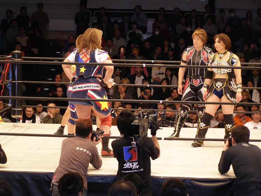 ◆NEO認定タッグ選手権試合 60分1本勝負<王者>田村 欣子元気美佐恵vs<挑戦者>タニー・マウス宮崎 有妃※王者組は2度目の防衛戦平成6年組同期によるNEOタッグ選手権。王者チームの田村&元気はシングルで。タニーと宮崎はタッグでここまでのプロレス人生を生き抜いてきました。シングルで実績を残してきた田村と元気が組むと、いかにも敵無しの印象を受けますが、実は意外に勝率が良くありません。これはかつての闘魂三銃士にも言えた事なんですが、シングルプレーヤーとして築いてきた立場や意地が邪魔をして、チームプレイに走れないから必要最低限の連携程度しかしない(出来ない?)ので、その辺を息の合ったタッグチームに突かれ、敗北を喫してしまうことを何度も観てきました。そのため、下馬評では”王者チーム有利”との声が多かった(ホールのお客さんの予想とか)のですが、私的にはマシンガンズ絶対有利と観ていました。そもそも、NEOのタッグの歴史を紐解くと、まず名を残したのはNEOマシンガンズですし、NEO創世記の北沢タッグ王座、板橋タッグ王座などは必ず手中に収めていました。(例外はあるとはいえ、基本としてトップどころは絡まないベルトでしたが)そして、NEO夏の風物詩ミッドサマータッグトーナメントはマシンガンズは2度優勝。田村&元気組も一度エントリーしたことがありますが、その際は準決勝でマシンガンズに敗れています。更に、NEOタッグ王座を新設するに当たり、北沢タッグと板橋タッグを返上し、ベルト資金集めに奔走したのは、ほかならぬマシンガンズ。ですが、初代王座決定戦となる05年のミッドサマータッグトーナメントにこそ参加(準決勝敗退)しましたが、以降タッグ王座戦線に絡むことは無し。マシンガンズにとってはやっと巡ってきた”自分たちのベルト”を取り戻すチャンス。むしろ、”自分たちが挑戦する時は一発で獲る”という気構えを持っていたはずです。普段のNEOでは前座の盛り上げ役に徹しているマシンガンズ。一方の田村&元気はメインどころ。王者の元気が”普段お笑いをやってるやつらに負けない”と挑発すればマシンガンズは”7年間、誇りを持ってお笑いをやってきた。だいたいあいつらは同期なのにウチ等しかセコンドにつかないのはどうなの? 上から目線を改めさせてやる”と、感情的に(笑)応戦。試合展開はマシンガンズがお笑い封印で田村&元気に挑みますが、この土俵は王者組のもの。王者組の一発一発にダメージを溜めていくマシンガンズ。それでも、マシンガンズはあきらめない!王者チームの攻勢に身をさらしつつも、フォールを返し続けるマシンガンズ。宮崎のムーンサルトフットスタンプで逆転勝利を掴みました!!勝利したマシンガンズの咆哮7年間の重み、守り通してきたポジションへのプライド。様々な思いが駆け巡っていたことでしょう。おめでとう、NEOマシンガンズ!!初防衛戦であっさり王座転落しそうで怖いですが(苦笑)