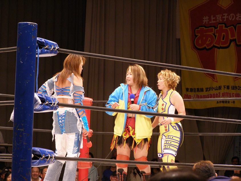 ◆第4試合 15分1本勝負三田 英津子中川 ともかvs木村 響子江本 敦子レボルシオン・アマンドラへ勧誘されている中川の動向が注目される試合。こういう試合って、どうしても子供の頃見た坂口&カーンvs長州&マサ組を思い出し、試合中に中川が三田さんを裏切りアマンドラ入りか?という流れを想像しちゃうんです。そういえば、小原が維震軍入りした試合もそんなだったなあ。ナマで観てたけど。ですが、息吹のブログでは”勧誘してくれるのは嬉しいが、『やる気が無いなら辞めちまえ』とか、大きなお世話。逆にこっちが三田さんとお前らを潰す”みたいな発言もあり、試合の方も不穏な空気も無く真っ向勝負。”唸れ豪腕”を狙う中川。中川って、ホントにいい選手なんですが、確かになんでも器用にこなしてしまうことから便利屋的なポジションにいますよね。熱い試合も出来る、コミカルもおまかせ、新人の壁から先輩への玉砕など。木村も江本も、考えてみれば中川と同じような存在だったですよね。”昔の自分たち”を中川に感じたからこそ、声をかけたのかなあと思いますし、逆に言えば、よくぞ中川に声をかけてくれた、と思います。中川にとってはアマンドラ入りはまぎれもなくチャンス。それを活かすか、あえて同じポジションで地固めをするか、それは本人の判断次第。少なくとも、”試合を壊す”という選択肢は中川ともかには無かったのでしょう。アマンドラと真っ向勝負の末、最後は江本の垂直落下式ブレーンバスターにピンフォール負け。負けはしたものの、”中川ともか”の価値、存在感をホールの超満員のお客さんに示した一戦でした。そしてアマンドラ入りするのか、しないのかの最終決断は、試合後の本人のマイクでした。中川「木村! 私はお前の言うように若くなけりゃあ、華も無いし、地味だよ。 でも、たった一度のプロレス人生、やっぱり上に行きたいよ!!」中川の選択はアマンドラ入り!!若き職人に終わるな! 上を目指せ、中川ともか!!