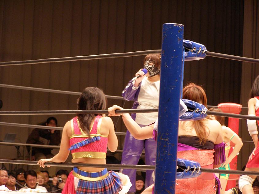 ◆メインイベント 30選手参加時間差バトルロイヤル初期NEO名物の時間差バトルが久々復活!05年5月5日だかにやって以来ですかねえ。その時は55選手参加ということで、流石に最後はグダグダだという印象がありました。井上京子6号まで出したら流石に厭きます(笑)まあ、過去は一度退場した選手が違うカッコで登場したりするのも楽しみの一つなのですが、今回はしっかり30選手が発表され、一人も被ることが無いという今までに無い30人バトルとなっています。で、今回はクライマックスシリーズルールというものを適用とのこと。どんなルールかと思っていましたが、試合開始前に特別な発表は無し。最終残り3人で3WAYでもやるんでしょうか?1番手・元気美佐恵2番手・倉垣翼元気と倉垣の対戦からスタート。大型選手同士の戦いで客席を沸かせます。3番手・さくらえみ3番手のさくらが出てきたとたん、元気と倉垣はターゲットをさくらに定め集中砲火。組し易い方に狙いを定め、長期戦を乗り切る腹積もりでしょうか。で、こうなると次に出てくる選手はさくらを助けるための選手になると思われるので、あおいちゃんあたりが早々に出てくるのかなあと思いきや、出てきたのはこの選手でした。4番手・田村欣子昨年さくらと組みタッグ王座を手中に収めた田村様登場!しかし、現パートナーの元気もリング上にいるけどどうするんだ?と思っていると、田村様、通常通りにリングを1周(笑)さくらがしきりに「よしこー! たすけてー! よしこー!」と目に入る位置まで来て助けを求めますが一瞥もくれず通常通りにリング1周し、リングインした後もたっぷり間をとっての霧吹き。さくら、元気と倉垣にやられっぱなし(笑)で、ようやく田村様が試合に絡みだすと、なんと元気と倉垣に蹴りをくれさくらを助けます。さくら、喜色満面で「よしこー!」と抱きつこうとしますが、田村様はさくらにも蹴りをいれます(笑) 田村様、全員が敵ということか。結局、田村様もさくらをいたぶりリング上は1対3。5番手・日向あずみ日向が登場すると、田村&元気vs日向&倉垣という形になり、さくらはコーナーで正座(笑)6番手・輝優優輝が登場すると、NEO、JWP双方からスカウト合戦。輝はJWPを選択。さくらがNEO側へ。7番手・宮崎有妃宮崎が日向に目突きを行こうとするが、誤って日向のホクロ(笑)を押してしまい、日向の怒りを買う。8番手・つぼ原人男子レスラー・つぼ登場により、女子選手全員で逃げまくる(笑)9番手・勇気彩勇気登場。リングイン後、近くでうつぶせになっていたさくらに正拳一発(笑)10番手・タニー・マウス11番手・小笠原和彦小笠原先生リングイン。先ほどのつぼ以上にリング上の選手逃げまくり。小笠原「女だろうが容赦しねえぞ!」そりゃ、みんな逃げるわな。まずは選手全員でつぼを向かわせますが、小笠原先生の蹴り一発で退場。退場1番手・つぼ原人次に空手経験者の勇気が小笠原先生に立ち向かいます。勇気、普段のリング上よりいい動き見せてました。もっと空手の動きを取り入れていいんじゃないですかねえ。勇気も小笠原先生の左ハイでピン負け。退場2番手・勇気彩12番手・趙雲子龍趙雲と小笠原先生が空中飛び蹴りで交錯。趙雲が先に倒れ掛かるも、実はやられたのは小笠原先生(笑)退場3番手・小笠原和彦13番手・大木アスカバトルお馴染み数珠繋ぎ。大木は場所が無く、ロープ上に登り、あわや退場の危機(笑)次にはヘッドロック。またも大木の居場所が無く、仕方が無いので末端のやられる側に回った大木(笑)14番手・りほりほちゃん登場。大木が攻めようとするも場内大ブーイング。さくらが連携を見せようとするも、りほちゃんそれを拒否。逆に退場の憂き目に。退場4番手・さくらえみ15番手・松尾永遠NEO軍がJWP軍を捉える形でりほちゃん中心の”にこにこ印”16番手・渋谷シュウ渋谷、コーナーに駆け上がって”いくぞー”をやろうとすると、倉垣に突き落とされかける。退場5番手・大木アスカ17番手・ランジェリー武藤入場と同時にヒザを押さえて苦しむランジェリー。松尾がランジェリーの着けてきたブラジャーを用いて叩く(笑)以降、続く