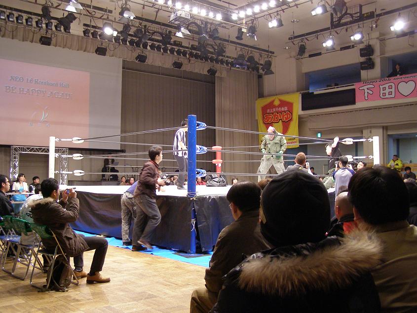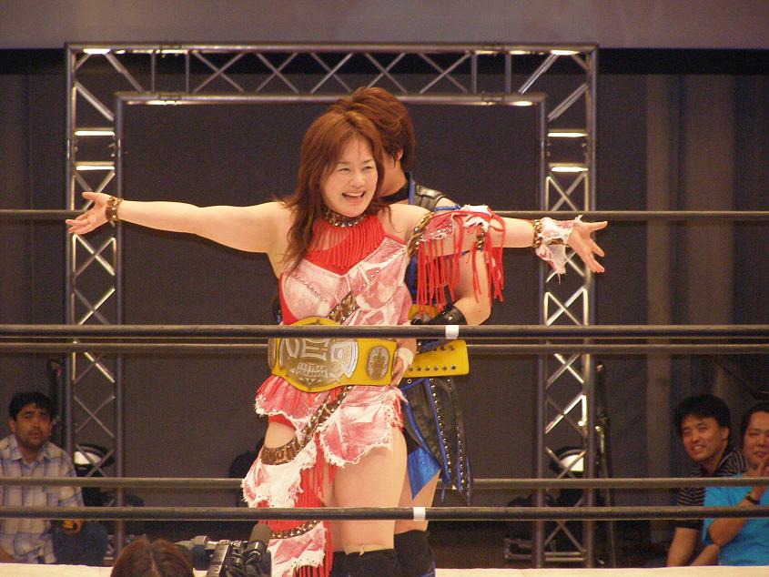 NEOを観るようになって早5年。そんなになるのですが、何故かタイミングが合わず、板橋と並ぶもうひとつの聖地・北沢タウンホールには一度も行ったことがありませんでした。今回はじめて行くにあたり、場所を確認。下北沢の駅から離れていないことから、そんな不安はなかったのですが、まあ、駅の階段を降りる場所をはじめ、高架橋の下とかいたる所に案内板が。こりゃ迷わなくていいや。で、着いてみると区役所施設を持っています。正に、名前の通り”タウンホール”ですね。それなら案内も多いわけだと納得。Future Starの当日券を購入してその辺を巡回すると、バスまで来てるじゃん。まあ、電車で来る人には無関係ですが。◆Future Star北沢大会EmiさんミニライブFuture Starの公式テーマソング(あおいちゃんのテーマ)を歌われているEmiさんによる歌のコーナー。『Future Star』をはじめ3曲歌われたのですが、最後の曲はご自身のライブでやられているという簡単な振りで盛り上げられました。◆さくらえみ前説さくら『今日会場に来られた方に質問です。 今日、ご来場された理由はなんですか? 次の4つからお選びください。 1.家が近所だった 2.アイスリボンの選手が好き 3.出場する他団体の選手が好き 4.さくらが好き みなさん一度だけ拍手してこたえてください』2番が一番多かったかな。で、4番に行く前にさくら『ここでルールを変更します。 みなさん必ず2回拍手してください さくらが好き!!』拍手6割、ブーイング4割(笑)しかし、さくらはブーイングを完全無視。◆第1試合 10分1本勝負野崎 渚(NEO)vs牧場みのり(アイスリボン)高校受験を終え、4月から高校生のみのりちゃんの復帰2戦目。本来ですと聖菜ちゃんが対戦相手だったのですが、風邪で欠場。NEOの野崎が相手です。みのりちゃんは柔道で体力ありますが、ここで目に付いたのは野崎。あら、ずいぶん筋肉がついてきたんじゃない?しっかり試合をつくっていたのも高評価。ダイビングボディプレスからの体固めで野崎の勝ちですが、それ以上に成長が目に付きました。この後のNEOで観るのが楽しみだ。◆第2試合 15分1本勝負勇気 彩(NEO)vsしもうま和美(アイスリボン)しもうま選手は世田谷が地元だそうで、応援団も駆けつけています。で、この試合も勇気が良いこと。単に力の差を見せ付けるだけではなく、しもうまの良いところも引き出してるし。いやいや、勇気と野崎はNEOで見てると物足りなく感じるが、こういう試合でみると非常にプロレスラーらしく感じます。しもうま選手の地元応援団の声援もあって、かなり場内ヒートしました。勇気がSTFで勝利。◆第3試合 20分1本勝負石川修司りほvs趙雲子龍松本浩代相変わらず男子インディーには疎い(いや、メジャーもか!?)私なので、石川選手をはじめて見ます。りほちゃんは勿論、趙雲も大きくはないでしょうから、実際何cmのかはよくわかりませんが、この面子ですとアンドレ級の存在感ですよ。最近はりほちゃんと松本浩代が因縁の対決となっているそうなので、楽しみな顔合わせです。趙雲も入場時に三節根を振り回し、掴みでは負けていません。石川と趙雲の男子対決からスタートしますが、りほちゃん、試合巧者ぶりを存分に発揮。巧みに石川選手を使い、松本浩代を翻弄。石川選手に”にこにこ印”を強要し、石川選手は恥ずかしさから松本選手に”お前のせいだ”とあたりちらすなどりほペースは崩れず。石川選手のアシストを受け、趙雲を3回転DDTでピンフォール!一部ファンからは”りほ様”と呼ばれているというりほちゃんの完勝でした。りほ「松本さん、今度あなたとはシングルで戦わないと いけないと思います。 NEOさんの後楽園で松本さんがチャンピオンになったら 私を挑戦させてください」りほちゃん、松本選手に握手を要求。松本が躊躇いながらも受けると、即座にモンキーフリップで投げ飛ばし、ジャンピングニーからの”オー!”りほ様、流石です(^^)◆第4試合 20分1本勝負ミスター雁之助リボン高梨矢野けい太vs宮本裕向忍佐藤悠己男子インディー6人タッグ。りほ様出場のタッグマッチでは気にならなかったのですが、この試合はみちのくプロレスルール(場外に選手が落ちたら、タッチ無しで控え選手に試合の権利を移動できる)で進んでいました。Future Starの試合ルールがそうなのか、男子の試合のみそうなのか。説明があったかなあ、無かった気がする。女子プロレスの特徴として、スピードを挙げる方、いらっしゃいますけど、手の合う男子選手同士だとむしろ技の正確さとかも含めてスピードも速く見えるなあ。◆第5試合 15分1本勝負真琴vs春山香代子インターナショナル・リボンタッグ王者の真琴がJWPタッグ王者の春山に挑む一戦。なんでも、三田さんが春山選手に負けたので敵討ちの意味合いもあるのだとか。側転式フットスタンプはかなり効いたらしく、しばらく春ちゃんがお腹を気にしていたシーンは印象に残りました。最後はダイビングギロチンドロップ。この技を春ちゃん