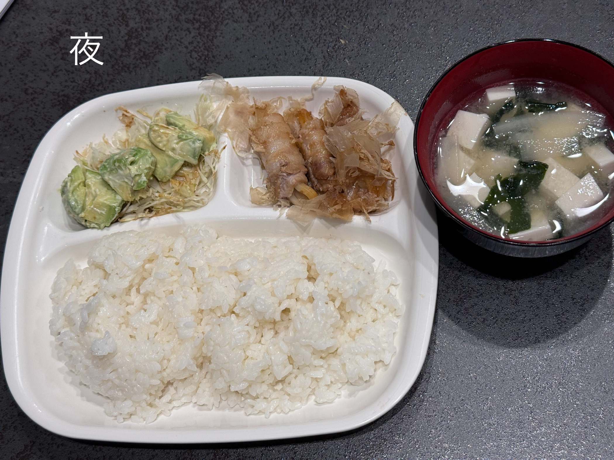 【夕食/818kcal】豆腐味噌汁、豚肉の大根巻き(おかわり)、アボカドサラダ、ご飯(タンパク質33g)