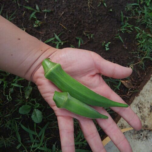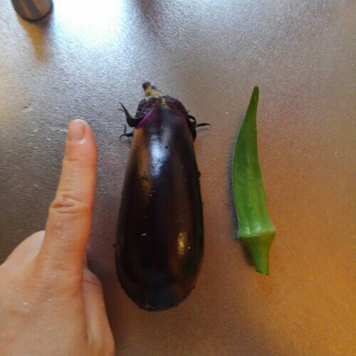 一日家を空けていたらおくらが巨大化していた。 明日になればあと二つとれるかな。 なすも順調! 収穫にはまだ早いけどね。