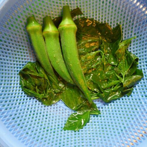 おくらが大きくなっている! 後ろの緑はモロヘイヤ。 モロヘイヤは花がたくさんつくんだけど、なんで?。 おくらは娘のリクエストでちらし寿司に入れて、モロヘイヤは私の納豆へ! うーん、夏の料理。 そして紫蘇。 手のひらくらいある。 でかい!
