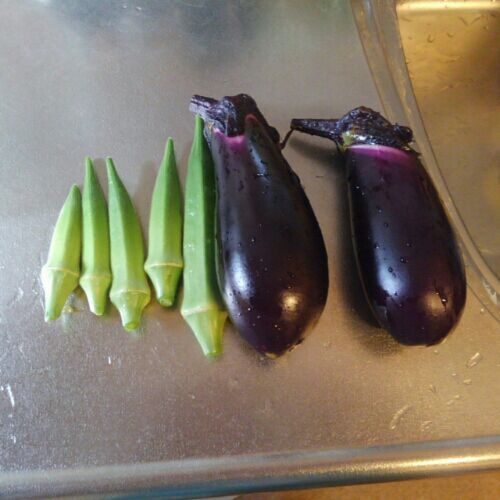 ついに収穫したよ。 少し小さいけど我慢できなかったー。 これからよろしくね! となりの今日のおくらはひとつ。 初収穫のなすといただいた、炒め物にすると美味しいというキュウリを炒めたよ。 となりのおくらはなにもしなかった。 嬉しいね。 毎日夏の味だね。