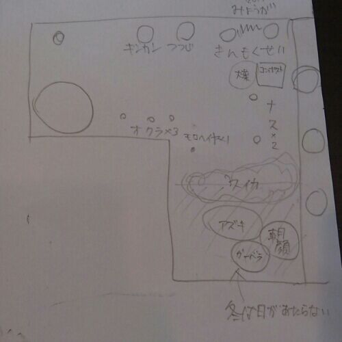 こんな感じだった。 すいかと小豆は予定外。 今月末には大根の用意を始めたいからすいかとモロヘイヤを終わらせないと… それか、おくらの場所に大根でもいいかな。 でもここは木の根っこがあって 根菜は難しいかもしれないなぁ。