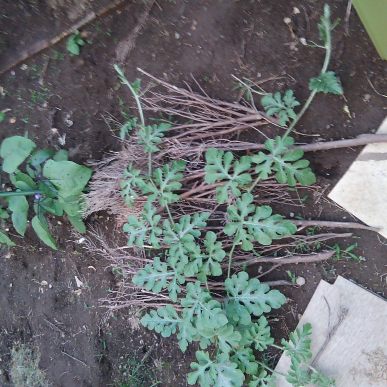 スイカの皮がとてもかさばるので去年スイカを食べたときに皮を庭で干してカサを減らしてから捨てた。ような記憶。そのとき種が落ちたんでしょうね、スイカが1本出てきた。ツルが伸びてきたから、わらのようなものを敷きたいけど、どこでわら買ってくるのかなぁ…。長ワラ 敷きわら売っているんだね…。