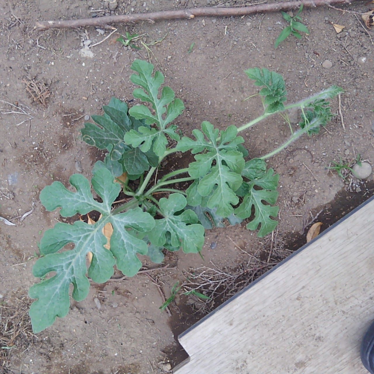 植えた覚えがないたぶんスイカ。だんだん大きくなってきた。ツルが伸びてきた。敷き藁の代わりに枝を利用してみた。どうなることやら…本当は苗や種を買って植えたほうが確実だよ。花ごころ スイカ・メロンの肥料 400g[野菜タネ]スイカ:大玉すいか新大和