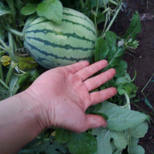 すいかが! 自分で受粉して実になっているー! と思ったら、 手の平大のスイカも! なんとー! うれしー! 画像が反対だった!