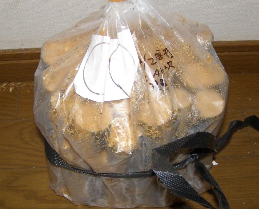 3月30日に消石灰水に浸けておいたエノキの短木。4月1日に水から上げ、培養袋へ入れ、バラケないように紐で縛って、袋の口を輪ゴムで軽く止め、ビンの上に逆さまにして、水を切っていました。