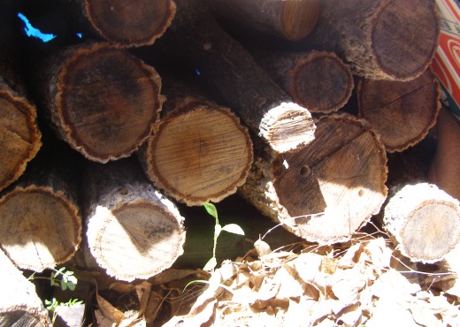 白い線は、原木を購入した時に付けられた本数チェックのチョークのあとです。丸いのが、菌糸の出ているところです。