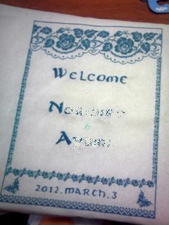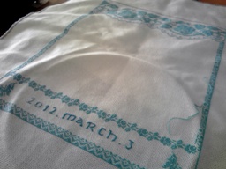 あいかわらず通勤電車内でチクチク中下の蝶々のところに 日付を入れますおひなまつりの結婚式に間に合うよう がんばりまーす