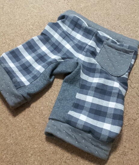 今まででいちばん作っている ハーフパンツです。縫い代を少し減らして作ったので110よりも 少し大きめ裾はゴムを入れたので ニッカポッカ風にしあがりましたポケットを省略したので 目印にフロッキーシートを貼りました。